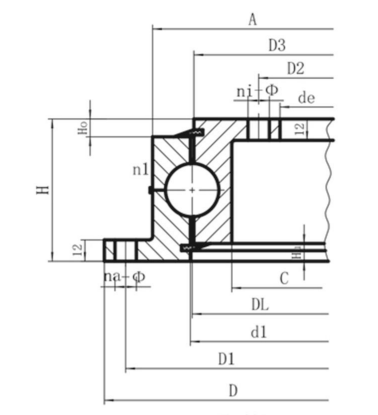 | DL | kg | D | de | H | DI | D2 | na | φ/M | ni | φ/M | t | n 1 | D3 | d1 | A | C | Hu | Ho | ||